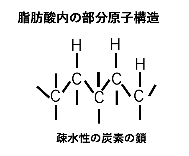 図 体の中の脂質分子、波線は炭素と水素がつながった構造でその部分は下の図に示す。