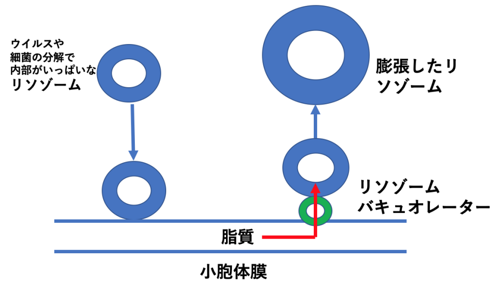 最先端の医学・生物学では、この脂質に関してどんなことが新たにわかっているのかここでH.Yangらの研究結果(H. Yang et al., LYVAC/PDZD8 is a lysosomal vacuolator, Science(2025) Aug. 21 issue p1-16)を一例として紹介する。細胞内には脂質からできている細胞内膜構造体が多数あり、その一つはリソゾームという。袋構造をしており中には、タンパク質、脂質糖質などを分解する酵素がたくさん入っている。細胞はウイルスなどの外部からの攻撃者を取り込むと、リソゾームと融合させ破壊する。このようにリソゾームは清掃工場である。従って、外部からの異物が増えて分解が進むとリソゾーム内には分解物が溜まりこれを薄めるために外から水が流入し膨張する。この膨張にはリソゾームの膜の増加が必要で、膜の成分である脂質が新たに追加されることになる。H. Yangらの研究によると、リソゾーム膜の脂質は、核膜につながる小胞体膜から供給される。そのため、リソゾーム膜と小胞体膜が接触しているのが観察される。かれらは研究の中で、この接触部位に特別なタンパク質が見つけており、さらにこのタンパク質の分子内には、水に溶けない脂質が、小胞体からリソゾームに移動するトンネルとなる構造があることが明らかにした。発見に基づきLysosomal vacuolatorとこのタンパク質に命名した大変興味深い発見である。膜の増加は細胞内の多くの膜構造、細胞膜にもあり、脂質を通らせるタンパク質が存在するとの発見は、今後の発展を予感させる。このように細菌やウイルス感染時の体内の細胞における仕組みは分子のレベルで詳しく研究が進んでいる。脂質の通過の仕組みをもっと詳細に明らかにすれば、新たな薬の発見にもつながると期待される。