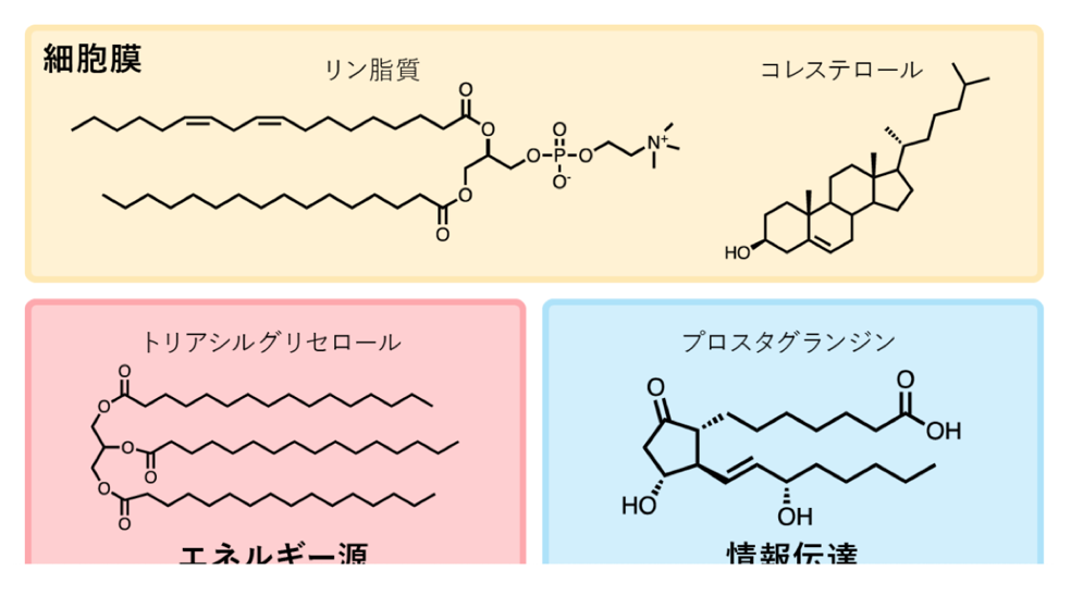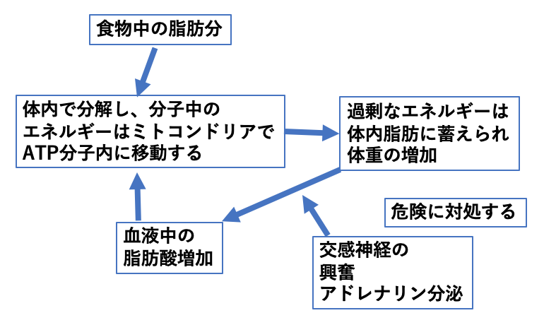 膜の脂質以外にも体の中にはビタミンの一種など、脂質からできるものがある(ビタミンA、E、D、K など)。しかし、脂質の役割の最も大切なものは、体の働きに必要なエネルギーを貯蔵することである。食物の中にはエネルギー源物質である澱粉などの糖分と、肉、魚、やミルクには脂肪がある。これらを摂取して我々は生きていくが、一般に体に必要なエネルギーを過不足なく食事で取り入れるのは難しく、いつも一定の余剰エネルギーを皮下や内臓の脂肪細胞に中性脂質として蓄えている。われわれの周りに危険があったり、困ったことがあると筋肉や頭を使ってこれに対処する。この時、危険を察知すると交感神経が興奮し、副腎からアドレナリンが分泌される。アドレナリンはシグナルとなり肝臓や脂肪細胞に結合し、その中の脂質粒という塊に溜められている脂質をリパーゼという酵素によって分解し脂肪酸を作り、脂肪酸は血中に放出される。血中の脂肪酸は脳や筋肉細胞に入り、分解されエネルギー源物質ATPが合成さる。ATPは脳を働かせたり、筋肉を働かせたりする原動力となり、危険に対処することになる。
